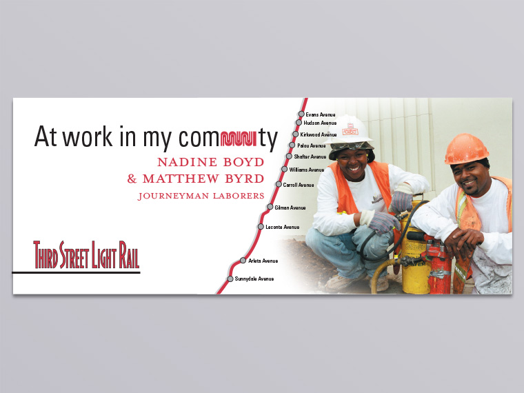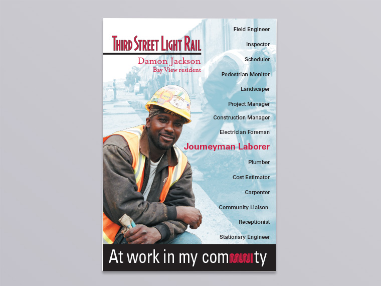 The Third Street Light Rail Transit Project was a construction project that expanded the Muni Metro system in San Francisco, California linking the established downtown with the diverse communities along the Third Street corridor. Over the course of the eight year project a variety of outreach collateral was designed to keep the community informed and engaged in the project benefits, construction impacts and work opportunities within the project.